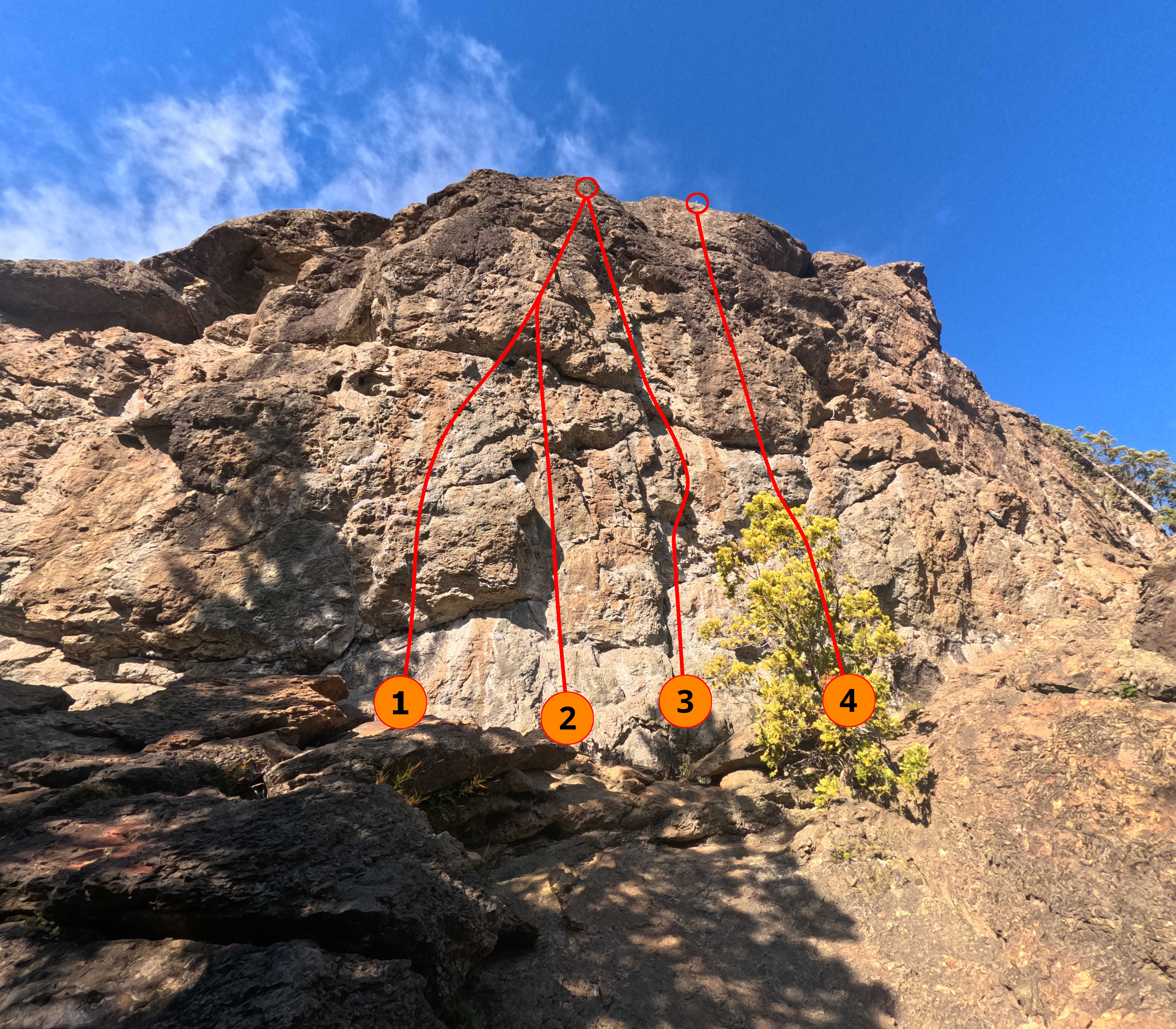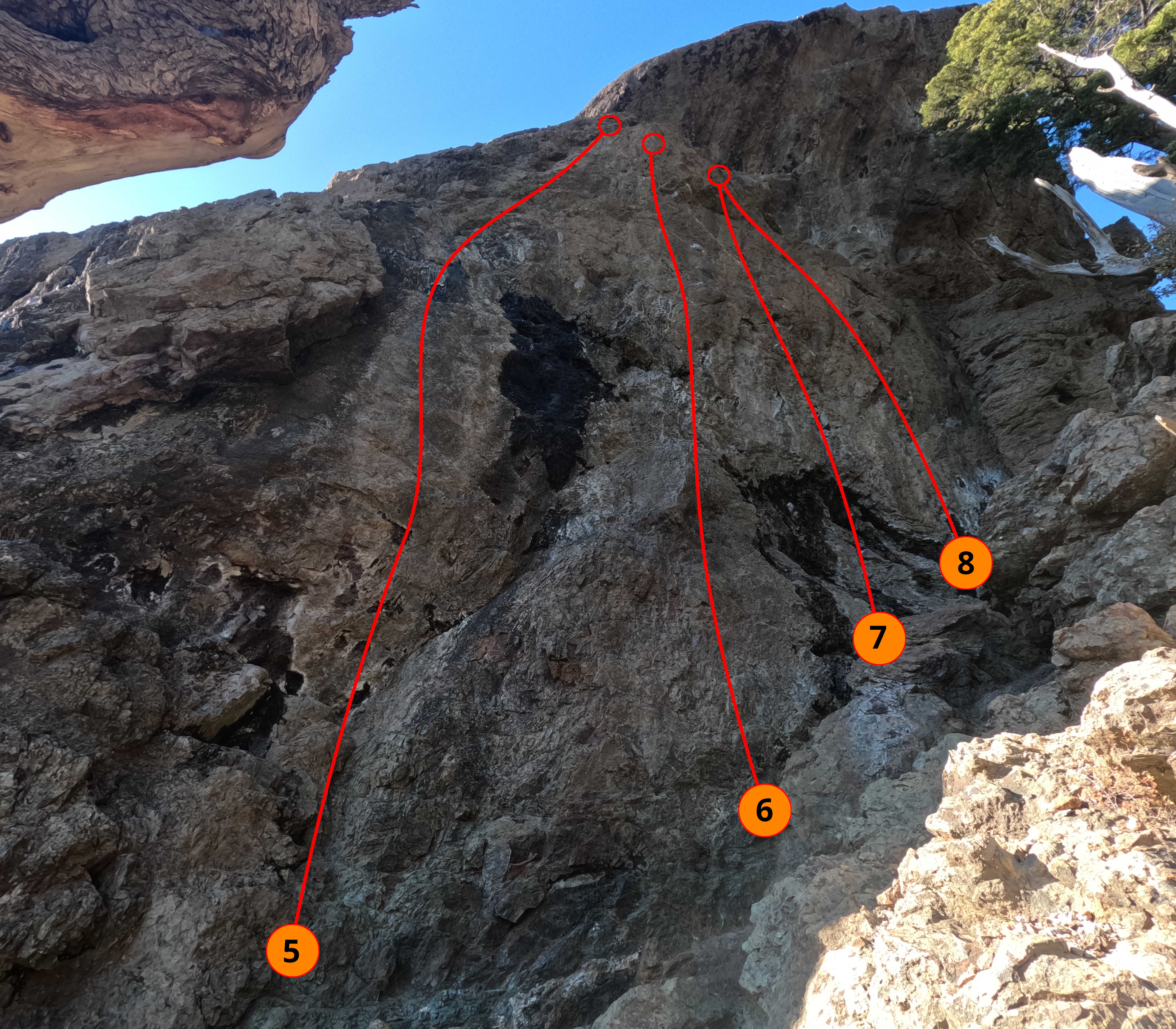 Todas las vías son de un solo largo y están equipadas con parabolts y descuelgue con argollas.